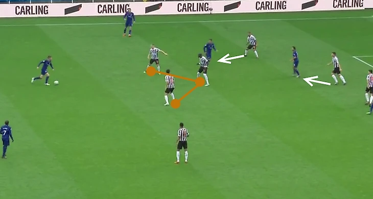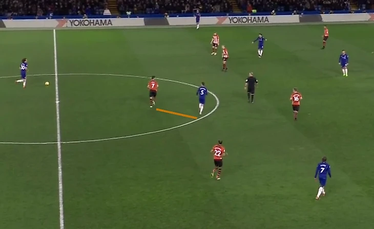 В обычных ситуациях, когда мяч у защитников «Челси», а команда соперников выстроилась на своей половине, за опеку Жоржиньо отвечает центральный нападающий.