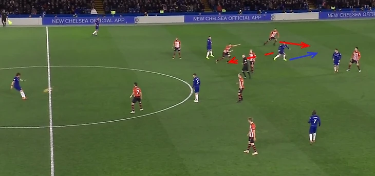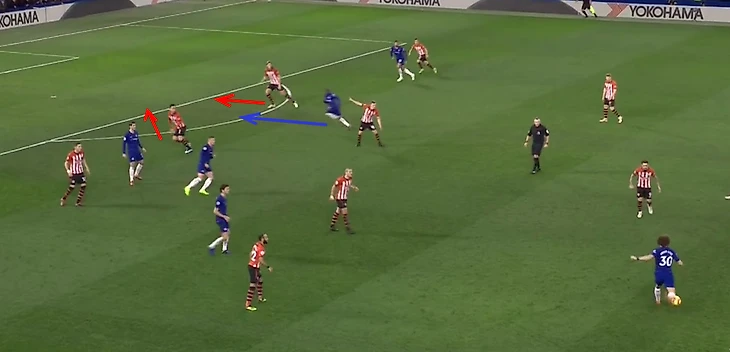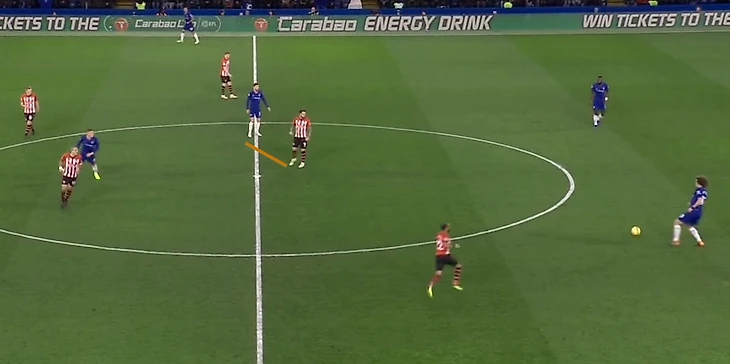 Игрокам обороны стоит всегда выдвигаться на атакующих футболистов «Челси», если они пытаются использовать зоны между линиями. Это один из самых опасных способов развития опасной атаки «Челси» – первый пас от Луиза, Жоржиньо или еще кого-то в зону между защитой и полузащитой, а там получатель решает эпизод. Поэтому иногда обороняющимся лучше сломать защитную расстановку, но не дать спокойно получить мяч перед штрафной.