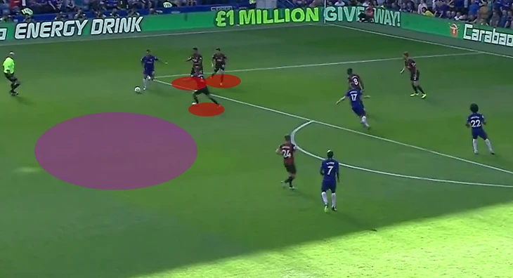 Третий шаг относится к игре в защите против любой команды, но для «Челси» он особенно актуален. Большинство игроков атаки: Педро, Виллиан, Мората – любят свободное пространство и чувствуют на нем себя гораздо лучше, чем при плотной опеке. К Эдену Азару, с его дриблингом, это относится в меньшей степени, но Азара мы закрыли еще на первом шаге, помните?