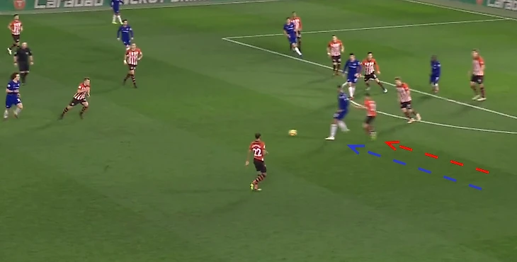 Когда дела со вскрытием обороны у «Челси» не идут совсем, в дело включается последний ресурс. Нголо Канте приходит в атаку, где его никто не ждет и находит свой момент.