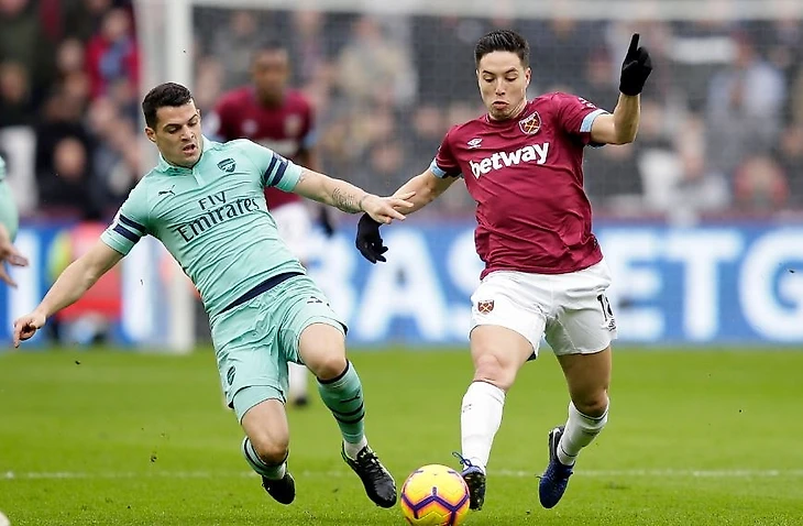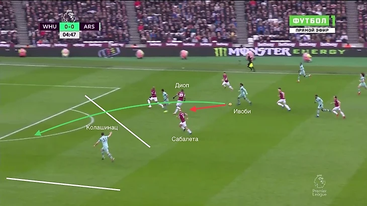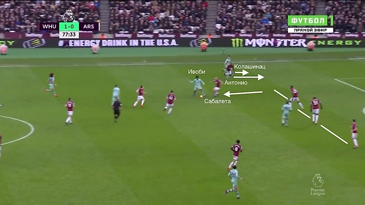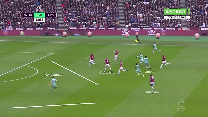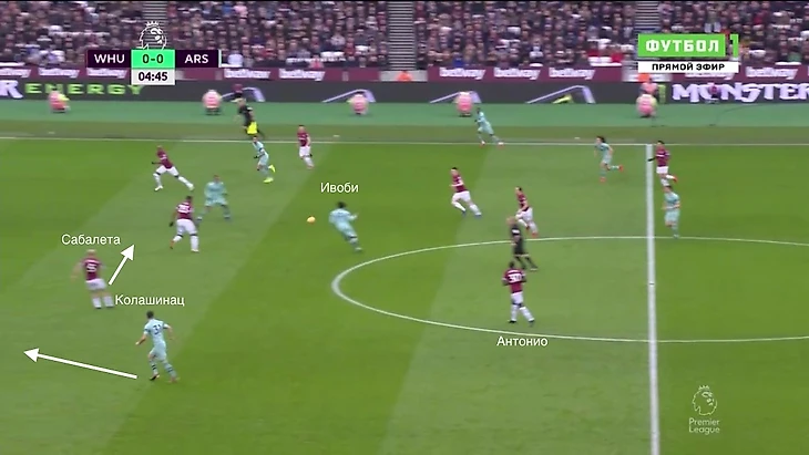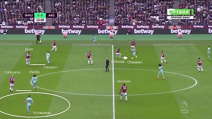 В начале матча Сеад Колашинац регулярно очень опасно открывался на фланге обороны "молотобойцев". Проблемы у команды Пеллегрини возникали по нескольким причинам. Во-первых, играя 4-2-3-1 против 3-4-2-1, "Вест Хэм" имел на одного игрока меньше в зоне центра обороны. Ивоби и Обамеянг заполняли пространство между крайними и центральными защитниками, а Ляказетт выдергивал цэнтрбэков из своих позиций, регулярно смещаясь в опорную зону соперника. Это движение заставляло крайних защитников смещаться в середину, страхуя центральных защитников и опекая инсайдов "Арсенала". Все это вдобавок накладывалось на традиционно узкое расположение линии защиты у "Вест Хэма". Из-за этого на левом фланге (им "Арсенал" атакует чаще) и даже полуфланге оставались катастрофически большие свободные зоны, которые атаковал Колашинац.