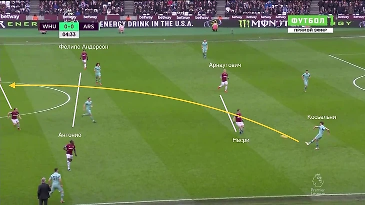 Владея мячом, "Вест Хэм" атаковал через фланги, преимущественно правым. Там прошло целых 47% атак команды. Это и то, что "Арсенал" постоянно садился слишком глубоко в позиционной обороне, привело к 7 угловым "молотобойцев" в матче (даже в последнем матче с "Ливерпулем" "Арсенал" допустил меньше - 5), один из которых они (пускай и косвенно) реализовали. Эмери также говорил об этом на пресс-конференции: "Мы не допустили много шансов у своих ворот, но мы уступили им метры пространства на поле, и эти метры привели их большому количеству угловых. После одного из них они забили, и матч изменился".