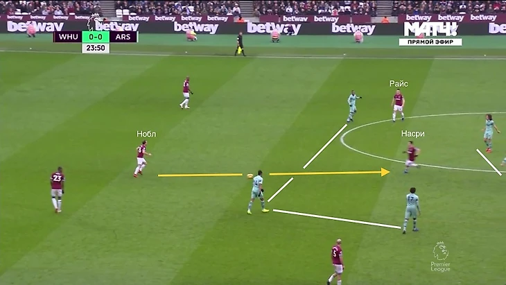 Если же команда Эмери пыталась строить позиционную атаку, "Вест Хэм" сам организованно давил на "канониров". Средний блок, структура прессинга 2-2, Арнаутович и Насри в первой линии атакуют центральных защитников, крайние полузащитники закрывают полуфланги и направления передач на крайних защитников. Также опорные полузащитники Нобл и Райс смотрят за Джакой и Гендузи. Гранит вообще, кстати, сыграл не лучшим образом. 34 передачи за 59 минут на поле - мало по его меркам, даже если учитывать, что "Арсенал" владел мячом меньше обычного.