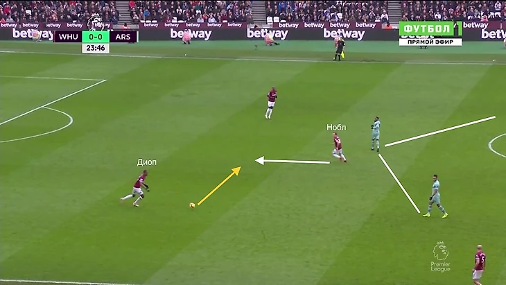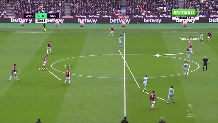 "Арсенал" прессинговал стандартно: в две линии по 3 и 2 игрока, средним или высоким блоком и без особой организации. Все попытки "канониров" препятствовать продвижению мяча заканчивались, когда под передачу в центре открывался кто-то из полузащитников "Вест Хэма".