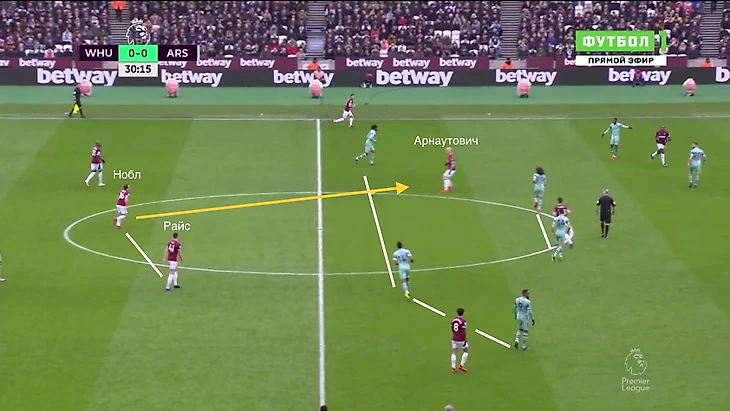 Прессинг "Арсенала" был недостаточно качественным и легко разбивался игроками "Вест Хэма". Команда Пеллегрини разыгрывала мяч по схеме 2-2 или 3-1, если один из опорных полузащитников опускался в линию к центрбэкам. Также регулярно под передачу открывался кто-то из группы атаки команды, это мог быть даже Арнаутович.