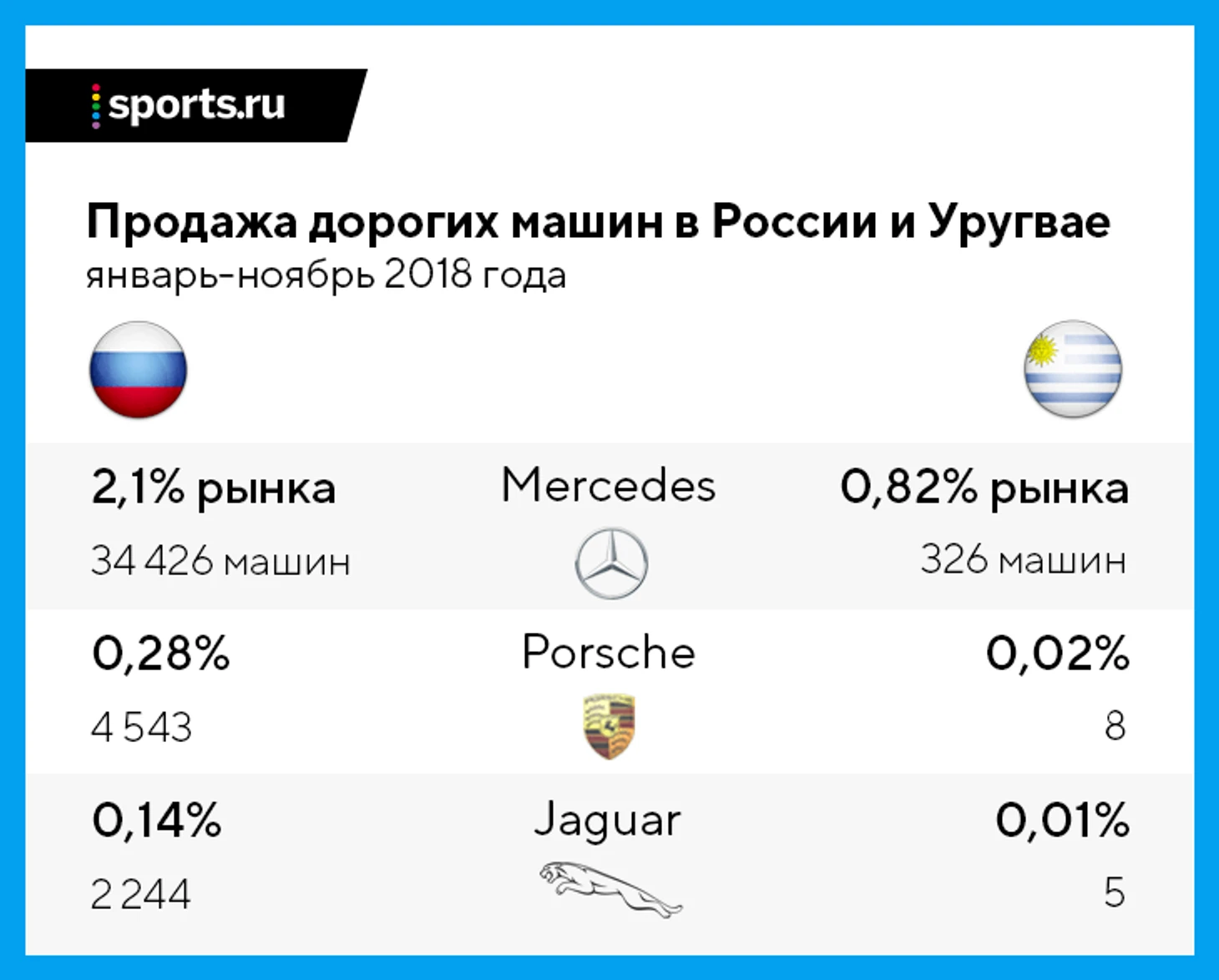 Абсолютные цифры красивые (всего 5 Ягуаров на страну), но сравнивать их все-таки некорректно: население Уругвая – чуть менее 3,5 миллиона человек.