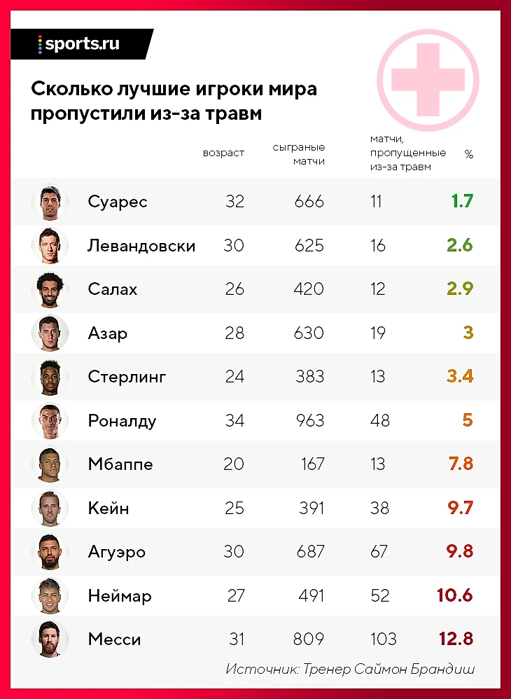 Список составлен на основе данных Саймона Брандина – ученого и тренера, который специализируется на цифрах в футболе (составляет рейтинги лучших форвардов в истории АПЛ и Европы, сложные графики на основе xG, а также рисует таблички результативности игроков «Ливерпуля» при Клоппе). Главный вопрос к списку – отсутствие Антуана Гризманна. По данным Transfermarkt, француз за всю карьеру из-за повреждения пропустил только одну игру.