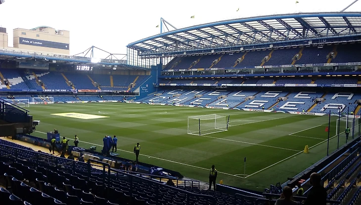 За два часа до матча выходим в уже довольно плотной толпе со станции метро Fulham broadway (да-да, "Стэмфорд Бридж" находится в районе под названием Фулхэм, в полутора милях от домашнего стадиона одноименной команды). Пара минут ходьбы посреди прилавков с шарфами и прочей атрибутикой, фонарных столбов, на которых растянуты изображения Жиру, Виллиана и других игроков "синих", и стареньких футбольных пабов по обе стороны дороги. Наконец слева, почти из ниоткуда, из небольшого просвета между домами выныривает невзрачный песчаный фасад одного из самых значимых стадионов в истории футбола. Слишком пафосно было бы говорить, что у нас захватило дух, но предвкушение, нараставшее на протяжении всего дня, практически достигло своего максимума.