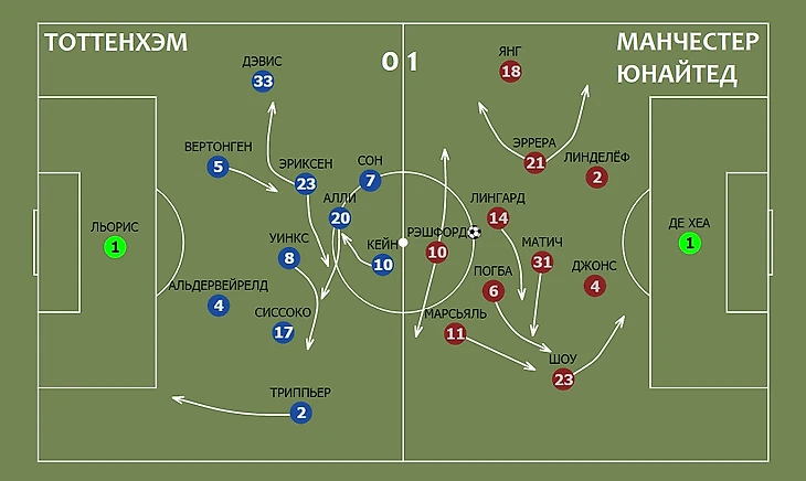Игру можно было разбить на три разных отрезка: две половины первого тайма и целый второй. В первые двадцать минут «Юнайтед» контролировал матч, не позволив «шпорам» создать ничего сверхопасного – из моментов было разве что врывание Уинкса в штрафную после розыгрыша аута и его же удар метров с двадцати. Сами же «красные дьяволы» довольно опасно били из пределов штрафной – Лингард промахнулся, а удары Рэшфорда и Марсьяля отразил Льорис. Единственный по-настоящему опасный момент у ворот Де Хеа пришелся на розыгрыш стандартного положения (аут ведь тоже стандарт) – такой уверенный контроль соперника дал именно отзеркаленный ромб: Лингард накрывал Уинкса, Погба и Эррера разбирали Сиссоко и Эриксена соответственно, а Матич ограничивал Алли. Да, при розыгрыше у своих ворот была ситуация 4-в-2, но впереди не оставалось свободных игроков (по крайней мере, им приходилось искать пространство и опережать соперников). Это спровоцировало крайних защитников «Тоттенхэма» подниматься выше и создавать численное преимущество на участках поля ближе к воротам «МЮ», но в итоге это обернулось против них: освобожденные от оборонительной работы (за исключением контрпрессинга и первой линии блока гостей) форварды оставались впереди и создавали моменты с успевавшим подключаться Лингардом, пока против них оставались лишь центрдефы «шпор».