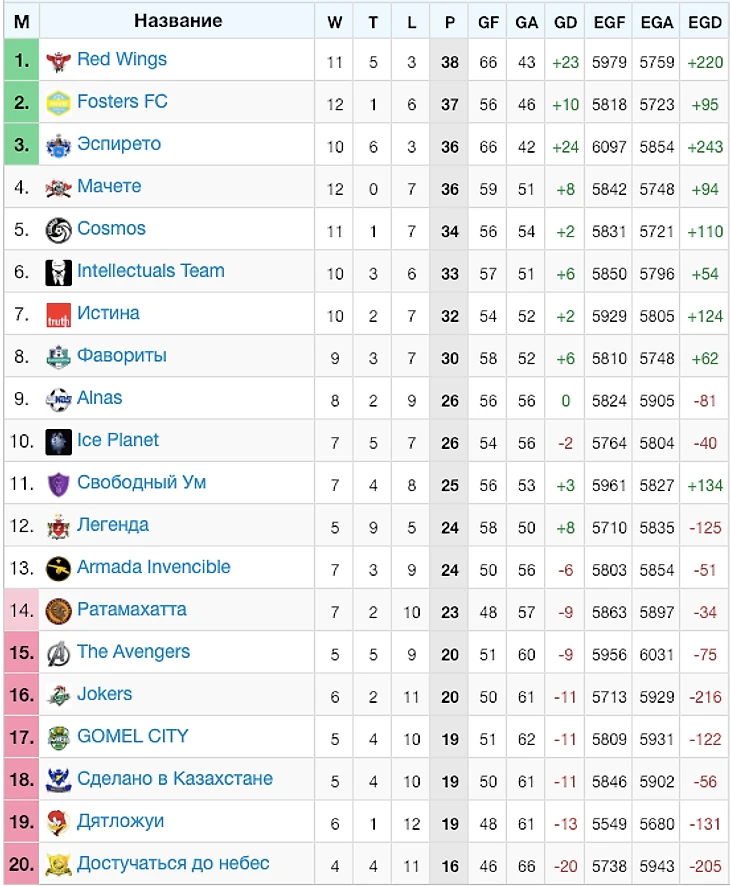 Intellectuals Team разгромили The Avengers со счётом 5:1. Результат вполне закономерный. Интеллектуалы набрали ход и это уже 6-я победа подряд, благодаря которой они поднимаются с 8-го на 6-е место. Мстители обратно упали в зону вылета, 15-е место и они продолжают борьбу за выживание.