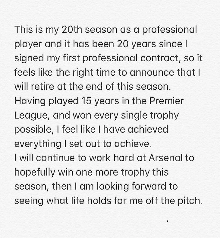 «Это мой 20-й сезон в качестве профессионального игрока, и прошло 20 лет с тех пор, как я подписал свой первый профессиональный контракт, поэтому я чувствую, что настало время объявить, что я заканчиваю карьеру игрока в конце этого сезона. Отыграв 15 лет в Премьер-лиге и выиграв все возможные трофеи, я чувствую, что достиг всего, к чему стремился. Я буду продолжать упорно работать в "Арсенале", чтобы, надеюсь, выиграть еще один трофей в этом сезоне, и я с нетерпением жду, увидеть то, что жизнь приготовила для меня вне поля».