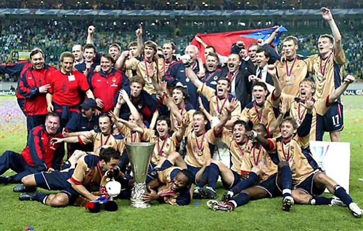 Потом был Кубок УЕФА, где ЦСКА выступил выше всяких похвал. Один за другим были пройдены португальская «Бенфика» (2:0 – 1:1), белградский «Партизан» из Сербии и Черногории, который перед этим довольно неожиданно обыграл днепропетровский «Днепр» (1:1 – 2:0), французский «Осер» (4:0 – 0:2), итальянская «Парма» (3:0 – 0:0), и португальский «Спортинг» в финале – 3:1. Причем решающий поединок за Кубок УЕФА проходил в логове соперников армейцев, в Лиссабоне на их родном стадионе «Жозе Алваладе». И после первого тайма ЦСКА проигрывал – 0:1. Но потом были голы Алексея Березуцкого, Юрия Жиркова и Вагнера Лава. Есть первый евротрофей у восточноевропейской команды!