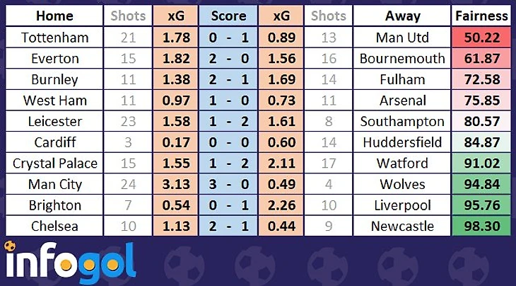 Самым несправедливым (с точки зрения модели xG) результатом стало домашнее поражение "Тоттенхэма" от "МЮ" со счётом 0-1.