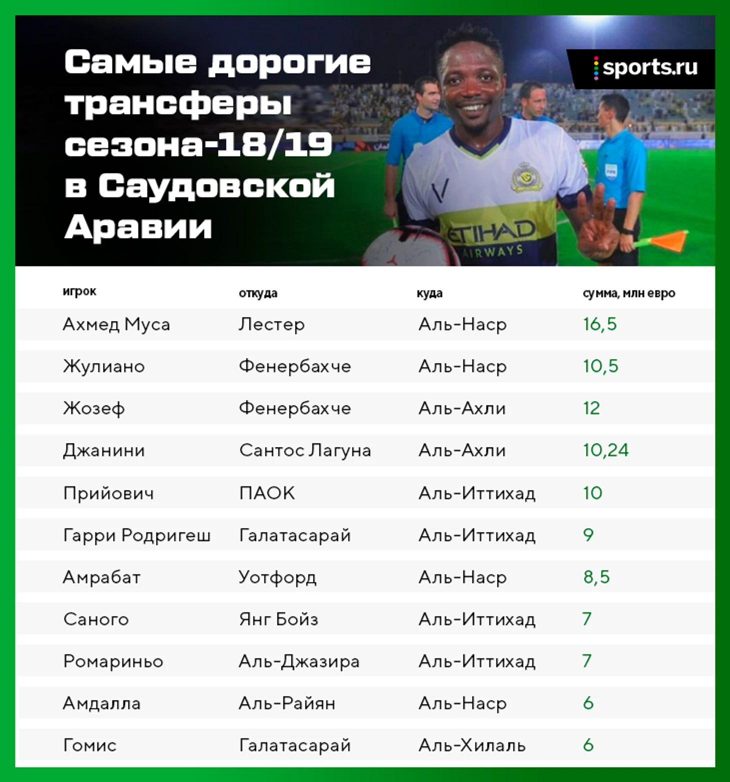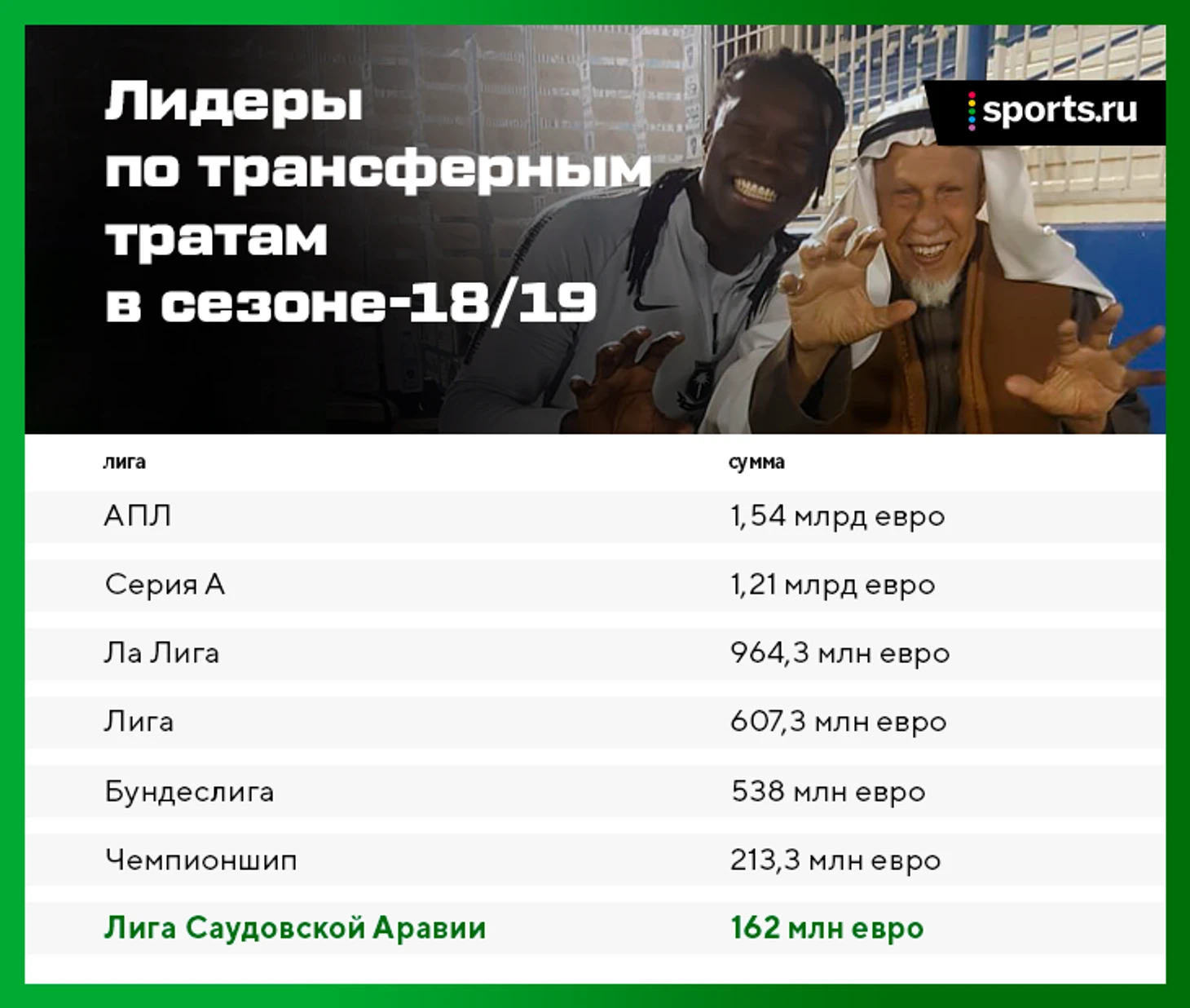 Первая шестерка выглядит буднично, но с седьмым местом явно что-то не то. Прошлой зимой Саудовская Аравия отправляла молодых игроков на стажировку в топ-чемпионаты, чтобы выстрелить на ЧМ. На ЧМ не выстрелила, но к футболу в стране не остыли.
