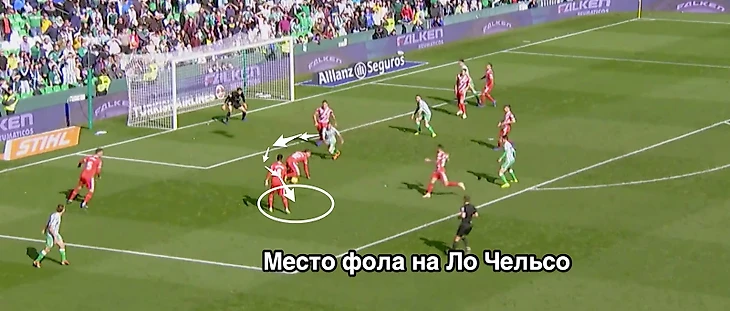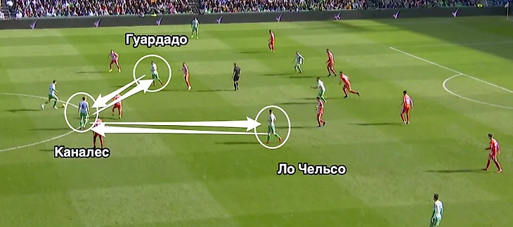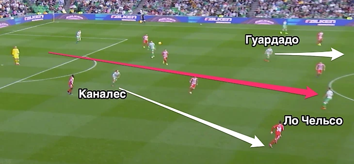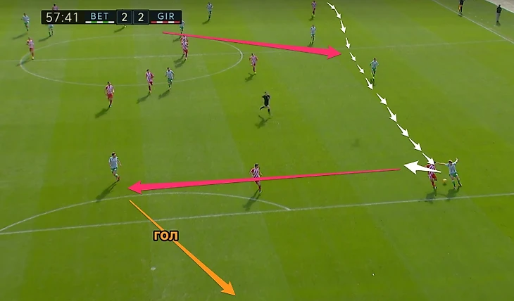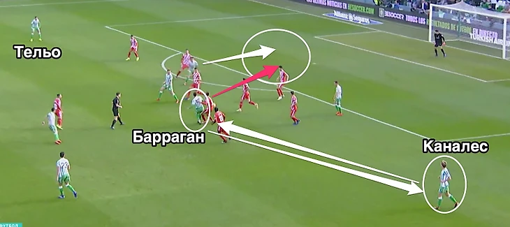 К слову, именно с очередного розыгрыша карты Пау Лопеса начиналась атака, принесшая голевой штрафной «Бетису». На кадре видно, как разорваны линии прессинга «Жироны» выходом Лопеса на позицию Хави Гарсии. Это позволяет и Каналесу оставаться в свободной зоне, и запутать двух опорных полузащитников соперника, одному из которых в любом случае приходится находиться в полупозиции. Так случилось и в этой атаке на 11 минуте: опорники проспали открывшегося в тыл Гуардадо, на которого пришла идеальная передача от вратаря.