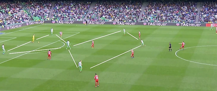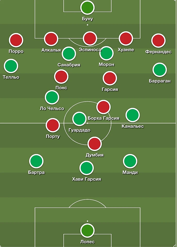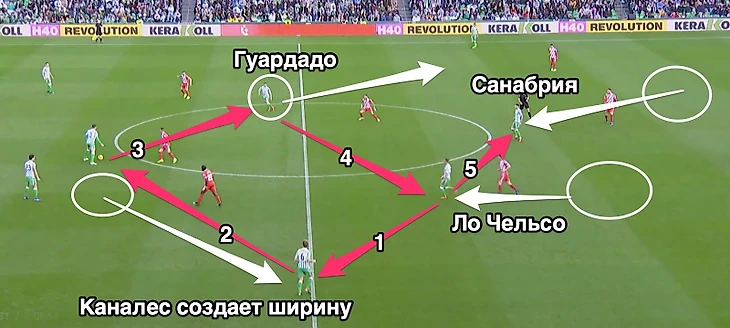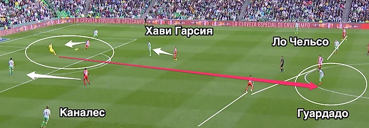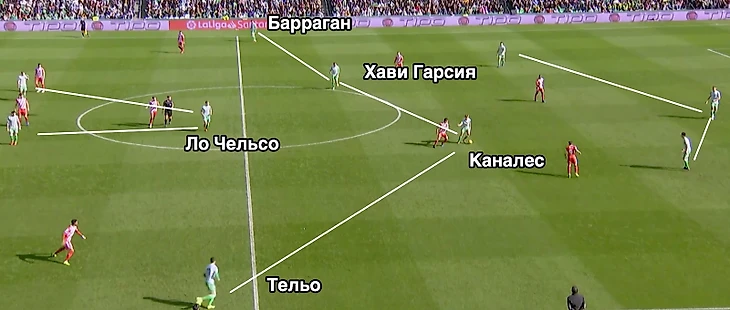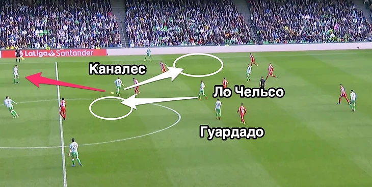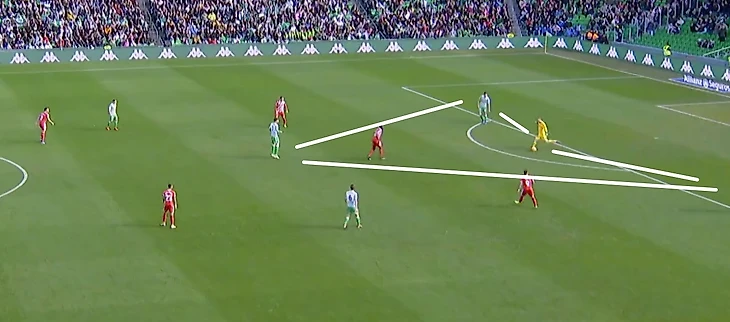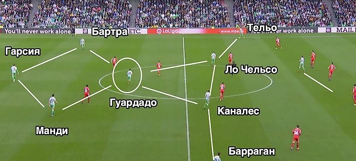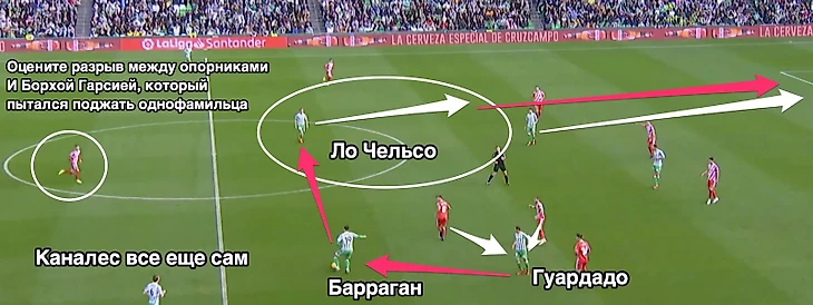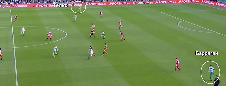 Против «Жироны», которые играли 1 в 1 по игрокам «Бетиса» при розыгрышах от ворот, Хави Гарсия выдавливался вратарем из тройки защитников, а Гуардадо выдвигался выше. В соотношении с постоянным движением Каналеса и Ло Чельсо это давало количественное преимущество в центре поля, реализовать которое было делом техники, техники Пау Лопеса. Он отыграл этот матч с процентом, немного ниже его сезонного показателя (72), но этого все равно хватало чтобы план его тренера действовал.