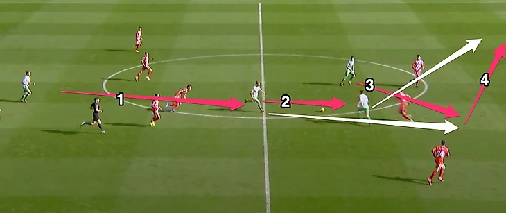 Как мы уже видели, в ситуациях и передачами кто-то из тройки заходил в свободные зоны, а его сменщики двигались в глубину для освобождения зон. Полузащитники «Бетиса» наполняют центр поля большим количеством стеночек, смещений, коротких передач, чем очень усложняют жизнь своим соперникам. Использование нападающих создает ситуации, в которых их оппоненты регулярно оказываются в меньшинстве в центре поля.