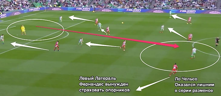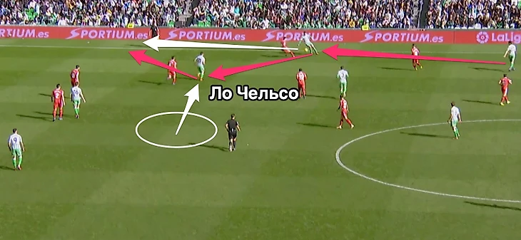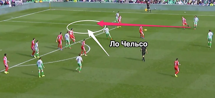 Такая маленькая перестановка еще больше развязала ноги самому атакующему из вышедшей в старте тройки полузащитников. Ло Чельсо начал играть выше, острее, постоянно выискивая свои мячи между линиями, выманивая на себя оппонентов разных позиций. По сути он стал первой опцией при вертикальном передвижении мяча командой.