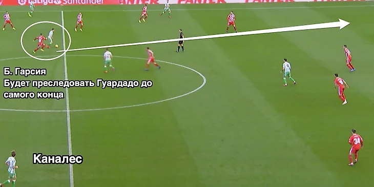 Но нужно отметить, что Гуардадо точно не играл роль «мозгового центра» команды и не собирал себе все передачи вперед, назад, налево, направо итд. С учетом того, что в «Бетисе» очень хорошо распределены созидательные роли защитников, полузащитников и даже вратаря, о котором мы дальше поговорим, Андрес много времени провел под присмотром Борхи Гарсии («Жирона» играла в 3-4-1-2 пытаясь 1 в 1 перекрывать оппонентов), а мячи часто шли мимо него сразу на Ло Чельсо / Канальеса, которые постоянно находились в движении.