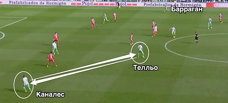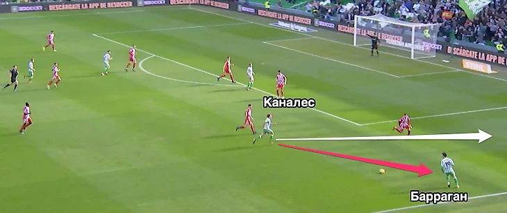 При этом нельзя сказать, что крайки просто выполняют роль игроков, растягивающих флангов и получающих передачи под навесы. Оба фланговых игрока Сетьена всегда являются неотъемлемой частью командных комбинаций и регулярно смещаются в центр, сменяясь с ближайшим полузащитником. В этом эпизоде Барраган нашел забегание Каналеса и круто занял его позицию, отдав передачу с перспективой стать голевой.