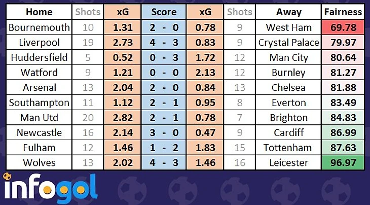 Самым несправедливым (с точки зрения модели xG) результатом стала домашняя победа "Борнмута" над "Вест Хэмом" со счётом 2-0.