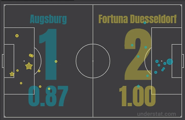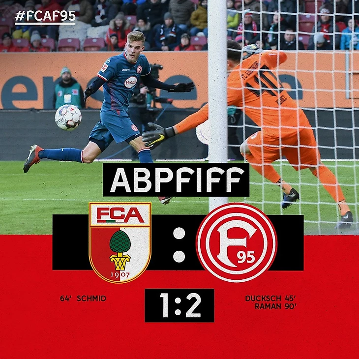 Обе серии продолжились. Правда, поначалу «фуггеры» захватили инициативу и создали несколько острых моментов. Но уже к концу первого тайма сдулись и «Фортуна» потихоньку перехватила инициативу, да так и не отдала до конца матча. Сначала Дукш забил свой первый мяч в Бундеслиге, замкнув подачу Лукебакио. Во втором тайме Шмид отлично исполнил штрафной, но атаки гостей все равно были острее и гол Рамана на добивании в самой концовке был закономерным.