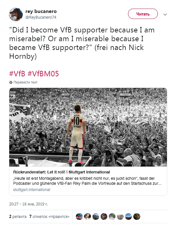 "Стал ли я фанатом "Штутгарта" от того, что я несчастен? Или стал ли я несчастен из-за того, что я - фанат "Штутгарта"?" (цитата писателя Ника Хорнби)