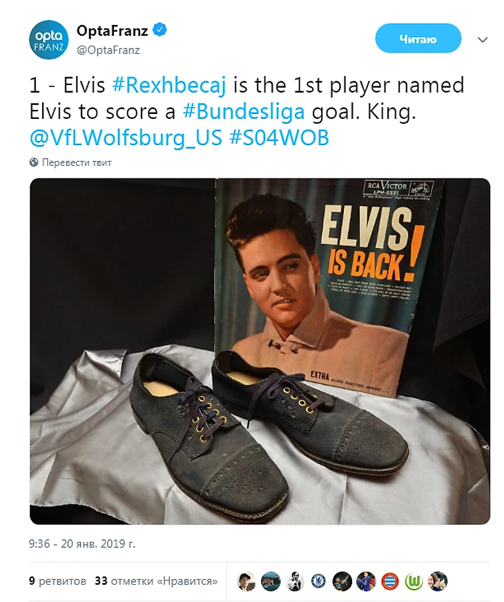 Необычный факт от Опта - "Элвис Решбечай - первый игрок по имени Элвис, забивший гол в Бундеслиге. Король!"