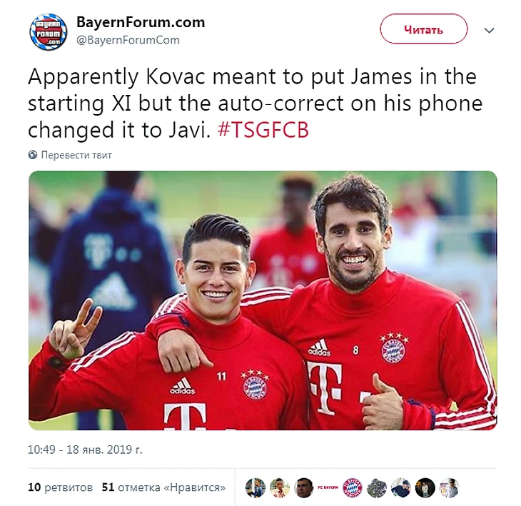 "Конечно же, Ковач хотел поставить в старт Хамеса, но автокорректор на его телефоне поменял "Хамес" на "Хави".