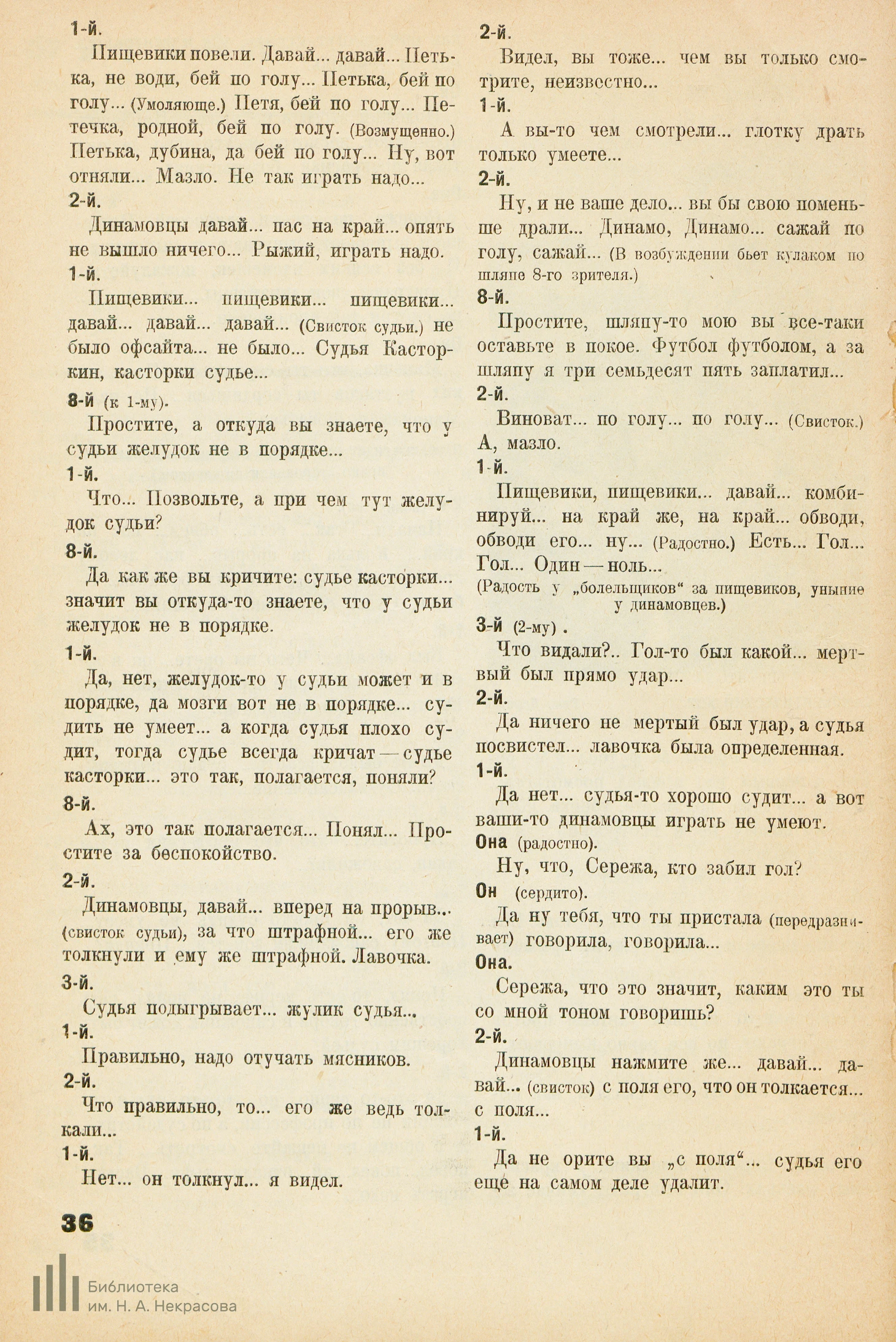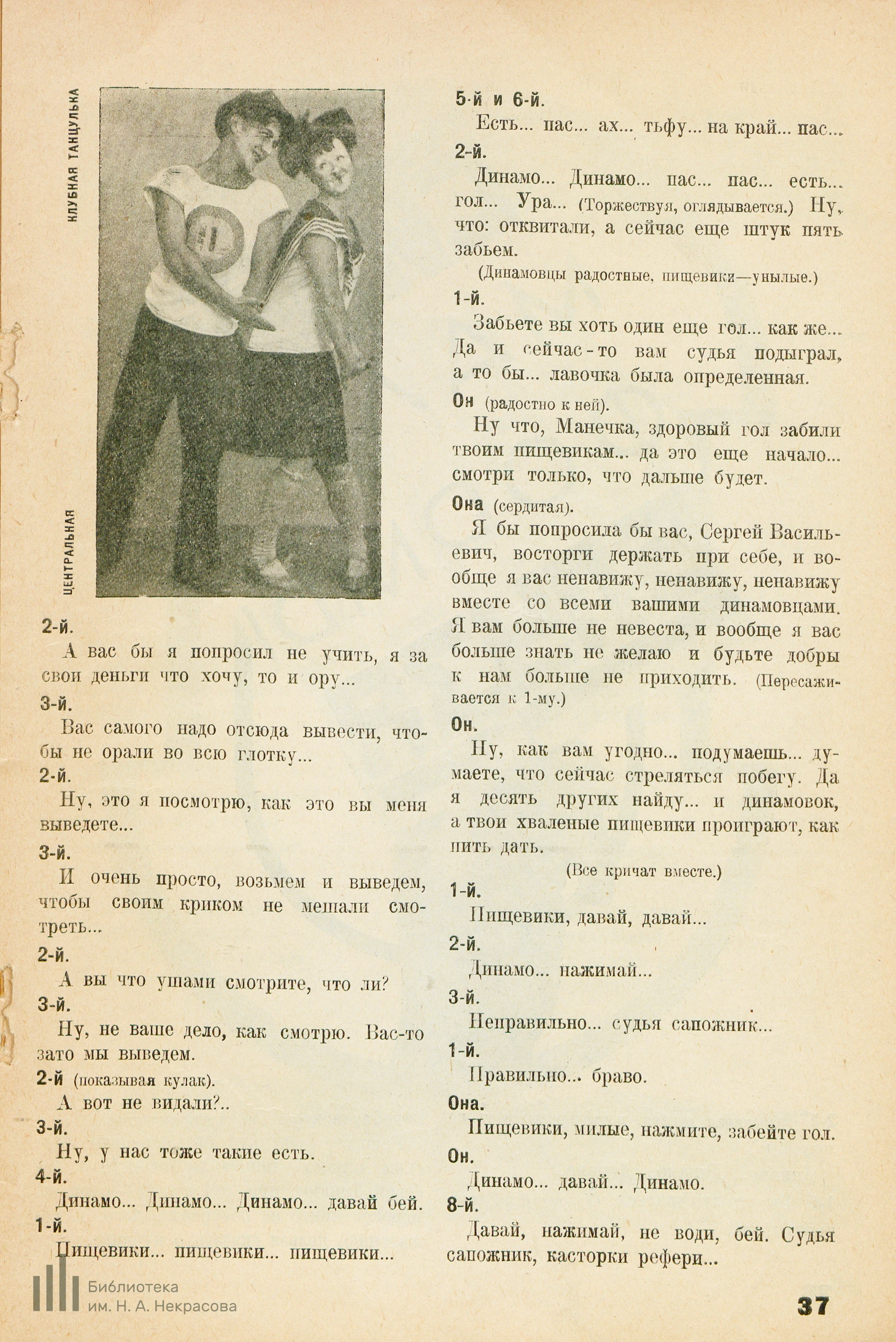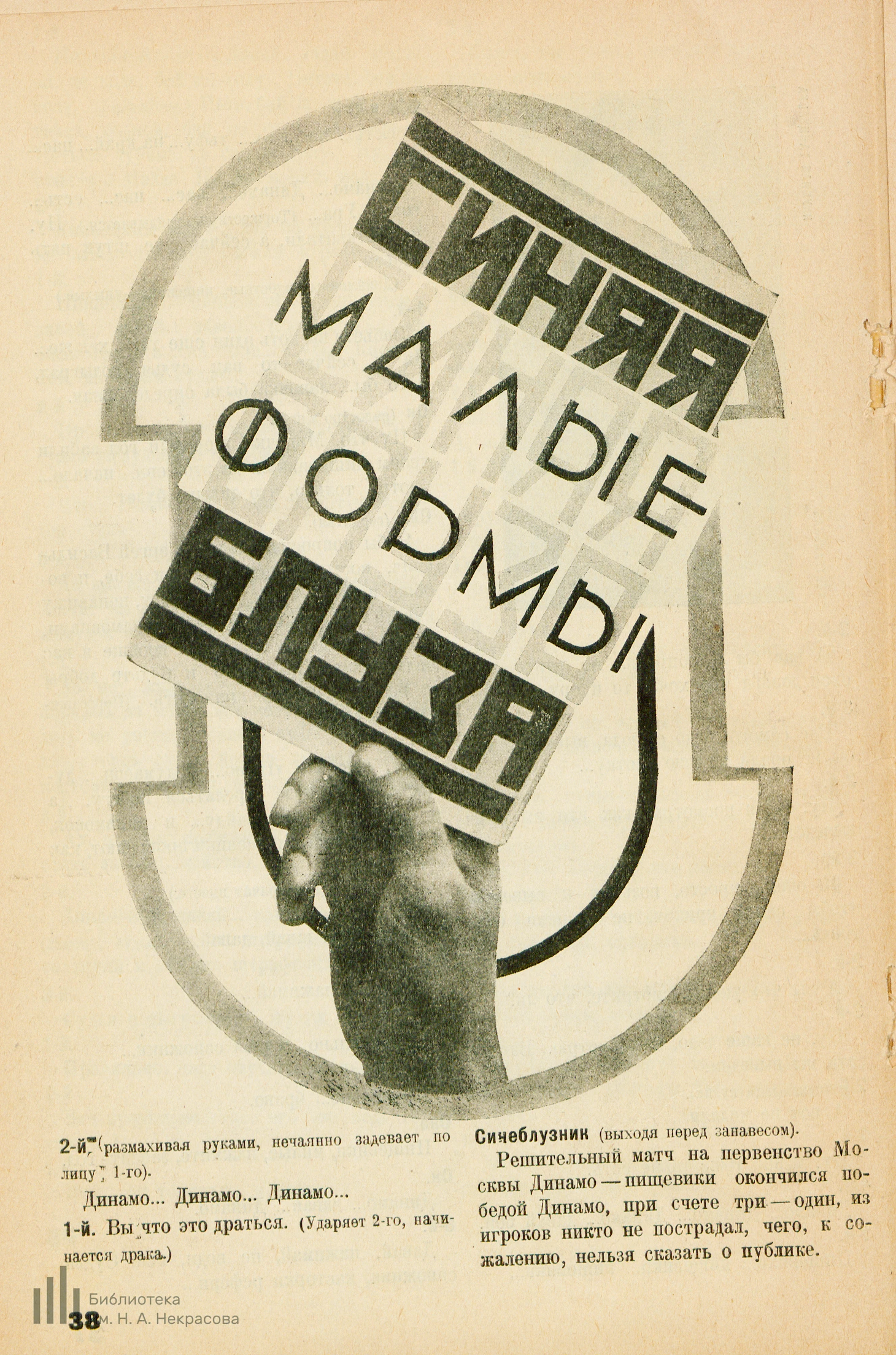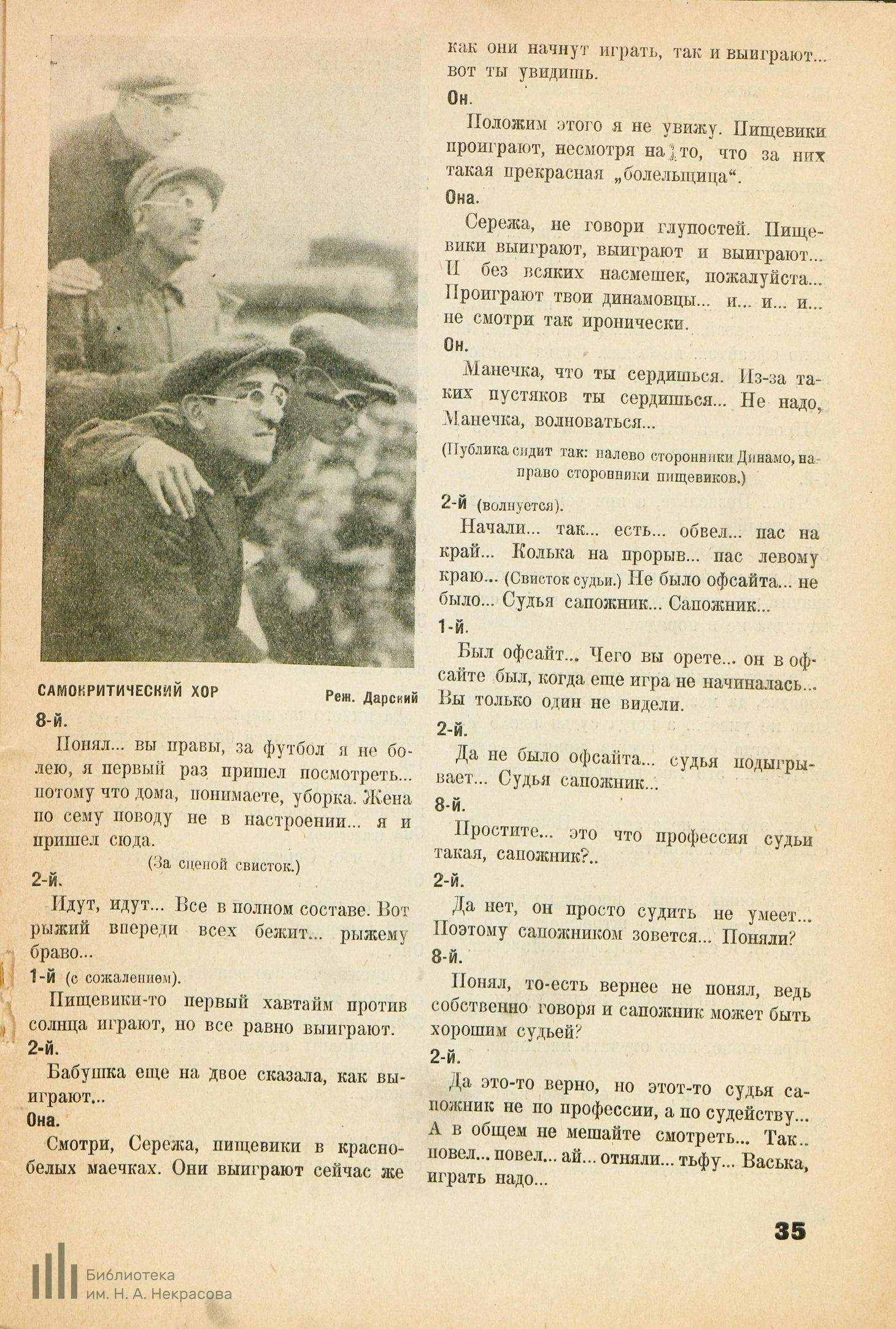 Начало советской эпохи характеризуется появлением нового революционного массового искусства. Среди прочих в 1920-ые годы популярностью пользовался эстрадный театральный коллектив "Синяя Блуза". В 1928—1930 гг. репертуар коллектива уже публикуется в сборниках «Малые формы клубного зрелища». В номере 9 (1929 г.) был опубликован сценарий пьесы А. Чикарькова "Футбол", отражавший культуру футбольного боления начала советской эпохи.