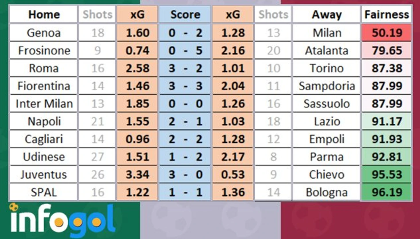 Оценка справедливости результатов 20-го тура Серии А от Infogol