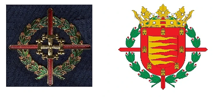 Верхняя часть щита, лавровый венок и мечи – та часть логотипа, что повторяет герб города (на фото). В его центре изображены языки пламени, которые, по самой известной версии, отсылают нас к мощному пожару 1561 года, погубившему большую часть города. Однако историки настаивают на том, что подобный символ использовался до этого у ряда кастильских знатных семей. Очертания крепостей, расположенных по краям герба, означают восемь башен, возвышавшихся над стеной, защищавшей город от напастей. Четыре меча и лавровый венок появились вследствие награждения города Орденом Святого Фердинанда – высшей военной наградой Испании (на фото). Её поселению даровал Франсиско Франко за отважные действия горожан против республиканцев во время Гражданской войны. На самой эмблеме клуба Орден появился лишь в 1962 году с разрешения муниципальных властей.