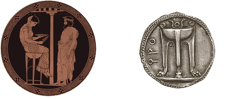 Как вы поняли, фигура в центре эмблемы, состоящая из трех линий, также относит нас к истории Древней Греции. Так дизайнеры изобразили античный штатив, который был символом старого Кротоне. Здесь археологи находили монеты, датируемые VI-V вв. до н.э., и на них также был изображен этот штатив. Согласно городской легенде, перед очередным путешествием к южноитальянским берегам ахейец Мискелло пошел к дельфийской жрице Пифии. Та, восседая на том самом штативе, пророчествовала ему строительство города на том самом месте, где сейчас располагается Кротоне. На фото ниже – античная монета из города и изображение пророчества Пифии.