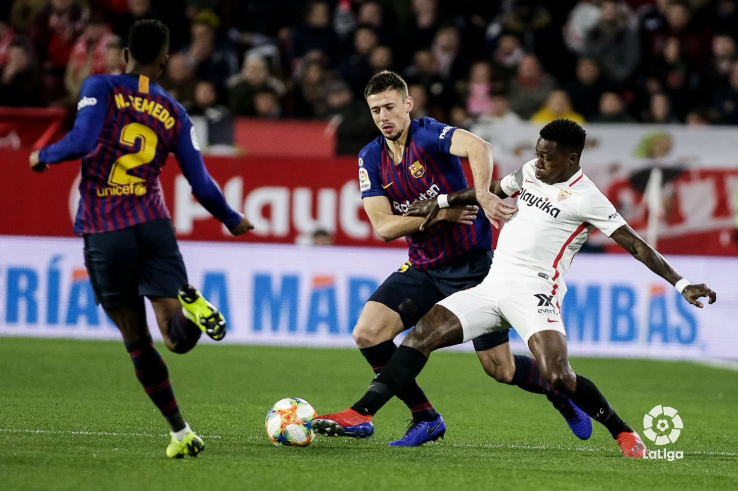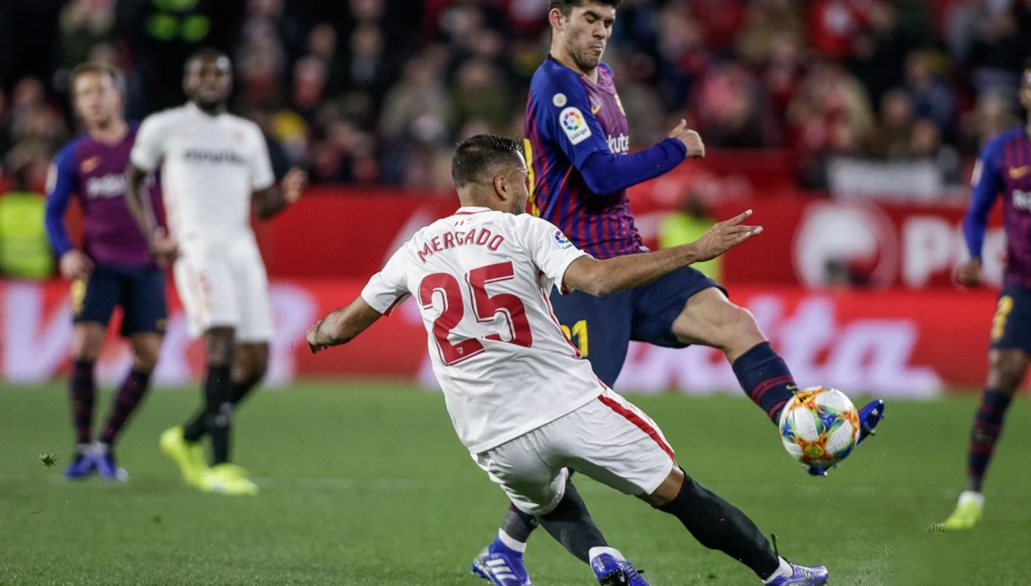 К уже традиционным разговорам про «Барселону» (команда с Месси, и без него — это два совершенно разных продукта), в преддверии противостояния добавились и перестановки в составе каталонцев. Желая дать отдых своим лидерам, Эрнесто Вальверде, сам того не желая, сильно ослабил её. Тройка Альба-Суарес-Коутиньо сменилась на Семеду-Мальком- Боатенг. И если с первыми двумя зрители и поклонники сине-гранатовых были знакомы, то вот Принс являлся игроком относительно новым. Однако, продемонстрировать что-либо толковое ему так и не удалось. Как, впрочем, и всей атаке «Барселоны» на большем протяжении первого периода. Неплохое движение, и перепасовки между игроками парировались не столько активным сопротивлением игроков «Севильи», сколько действиями самих футболистов «блауграны», которые попусту не могли собрать воедино эту разбитую на пазлы атаку. На их фоне, более организованно, и с большим акцентом на эффективность, действовали красно-белые. Вначале они максимально плотно действовали в центре, и половине поля соперника. Затем, начали задействовать фланги, расшатывая то один, то другой участок поля, в том числе, за счет скоростных маневров Хесуса Наваса, и Эскудеро. Более пассивно, по сравнению с ними, действовал Квинси Промес, который в принципе переживает не самый лучший момент в своей карьеры. Однако и он старался играть на коллектив, показывая хорошее движение без мяча, с частыми рывками за спины защитникам.