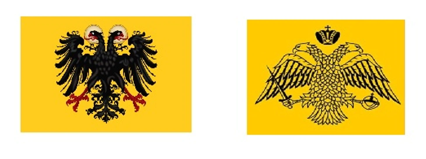 Слева – флаг Священной Римской Империи. Справа – флаг Византии. Это более поздние версии их знамён, на которых орёл изображался двуглавым, тем самым символизируя равенство светской (государство) и духовной (церковь) власти