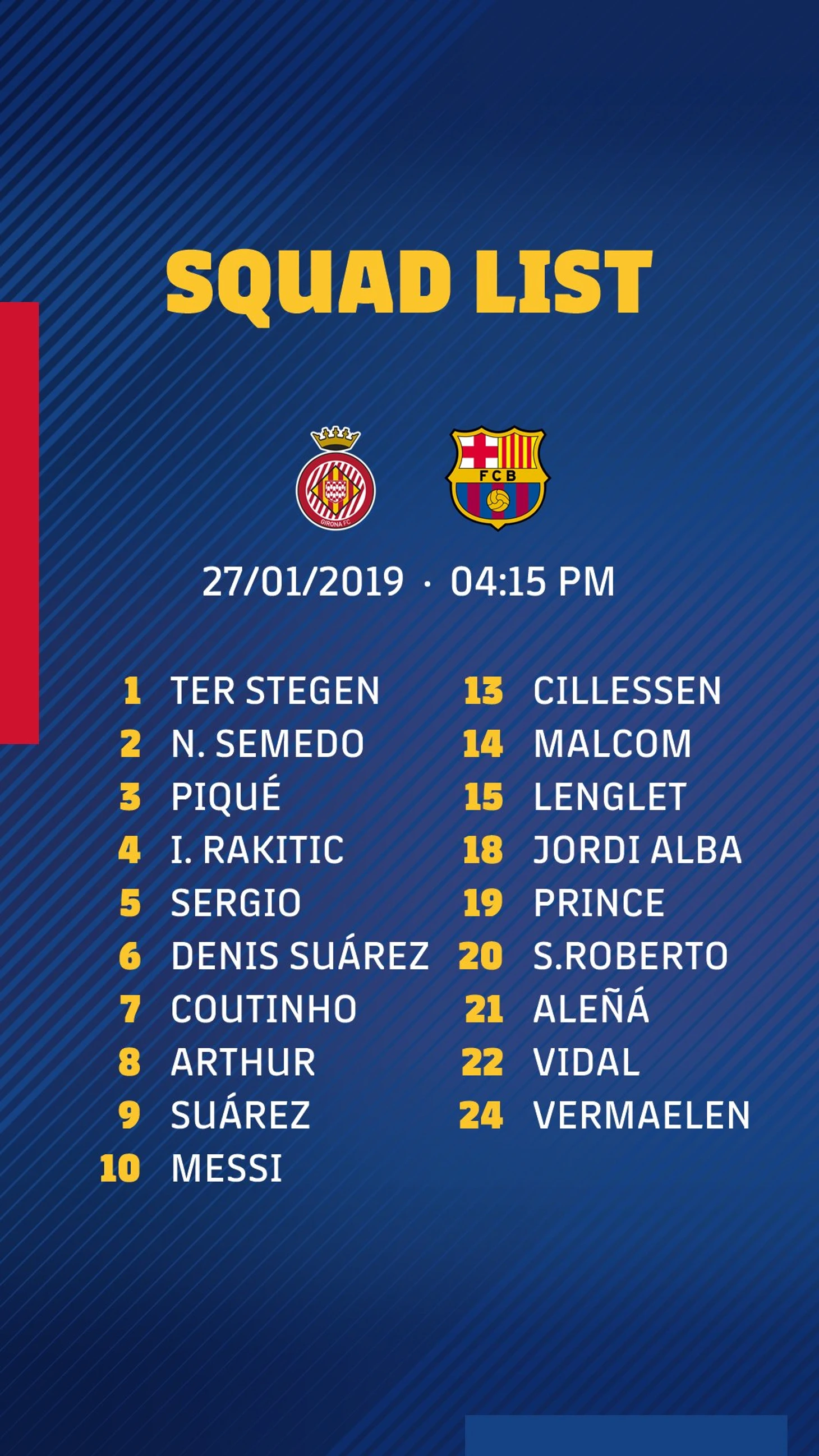 Месси и Бускетс попали в заявку на матч с «Жироной» после отдыха, который Эрнесто Вальверде предоставил им в матче 1/4 Кубка Короля. Новичок сине-гранатовых Кевин Принс Боатенг также указан в заявке. Это будет его второй матч в составе «Барселоны».