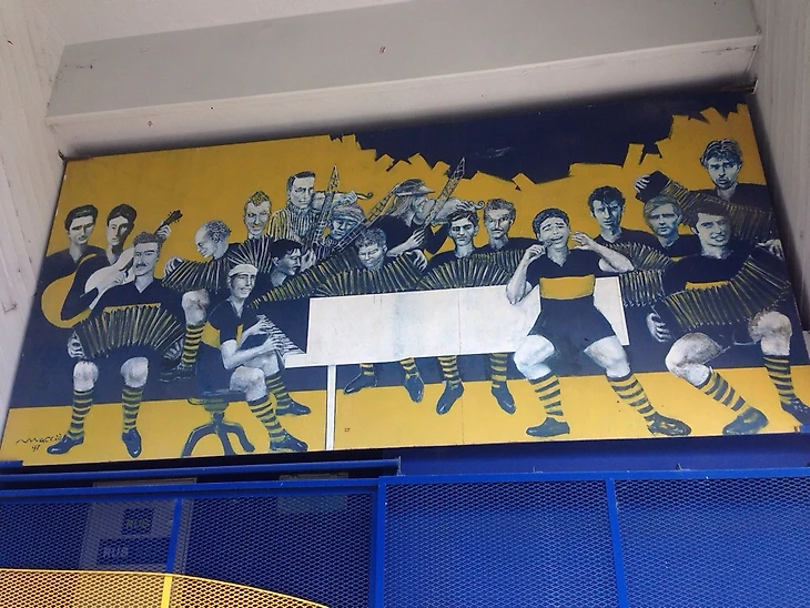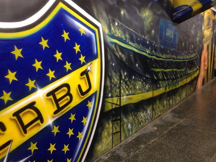 На фасаде главной трибуны нарисованы картины, конечно же, в сине-золотых тонах. На одной из них игроки «Боки» изображены в виде музыкальной группы.
