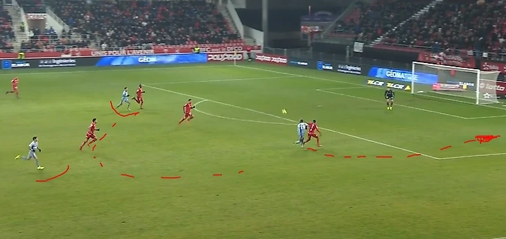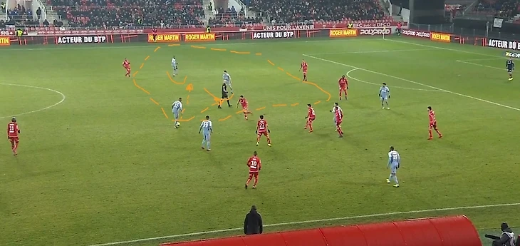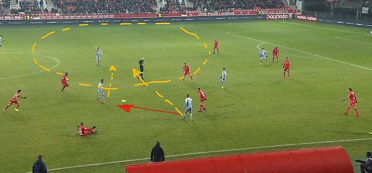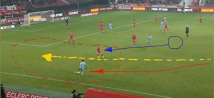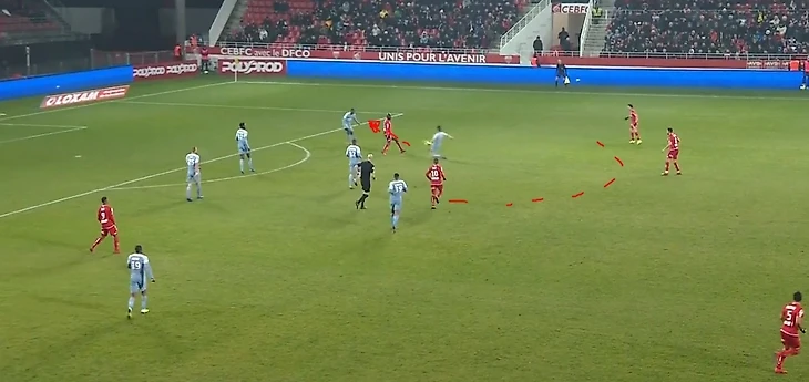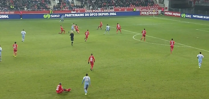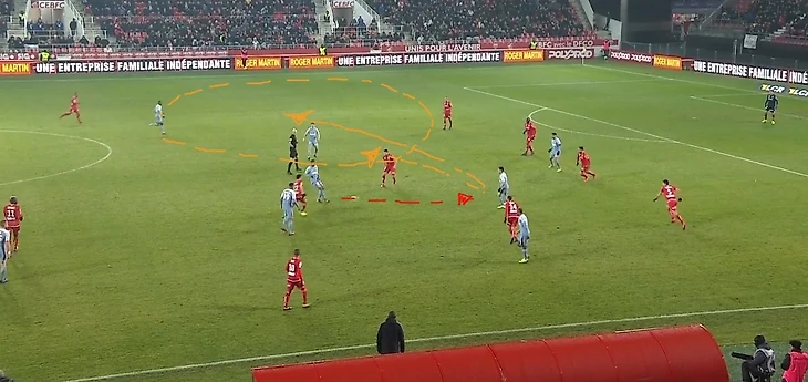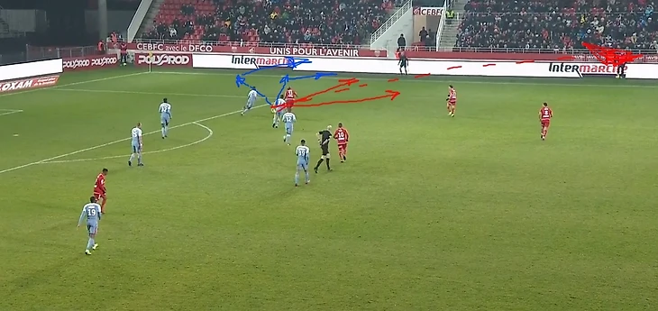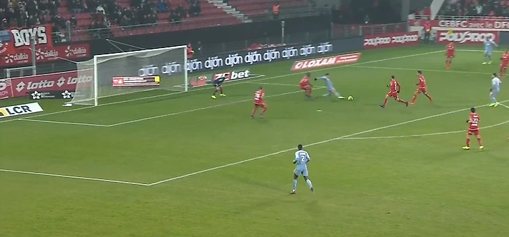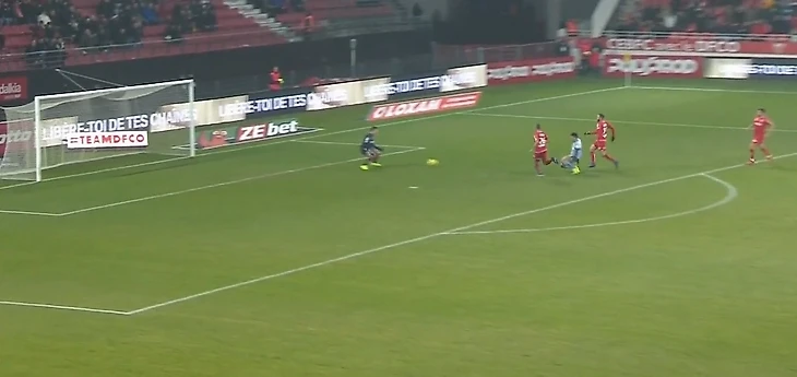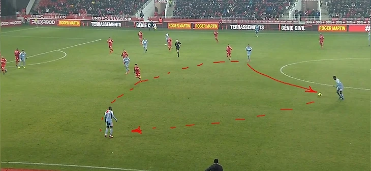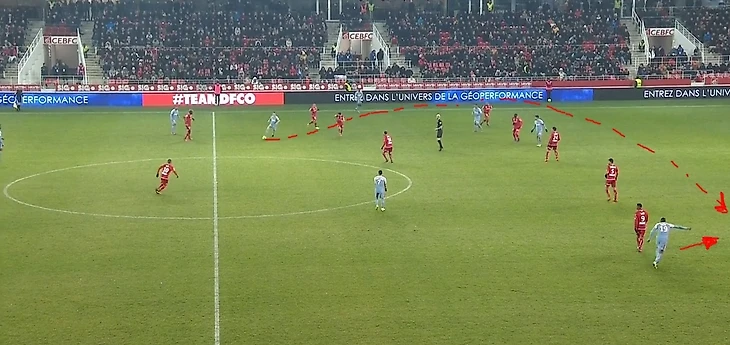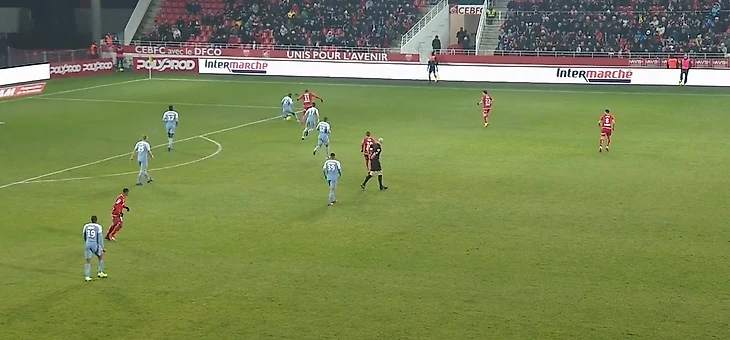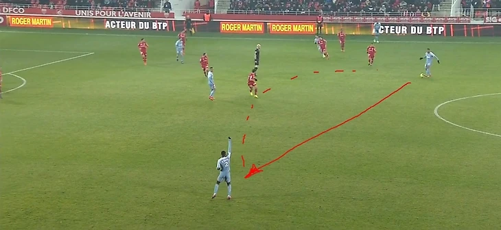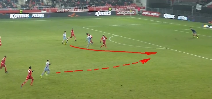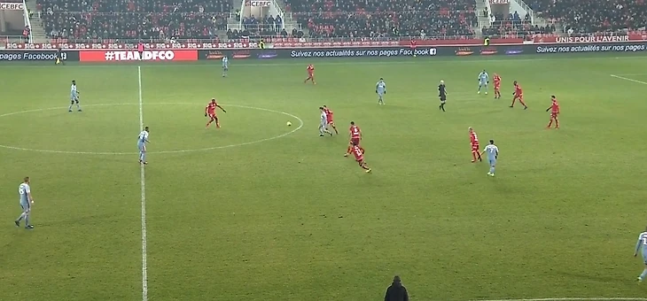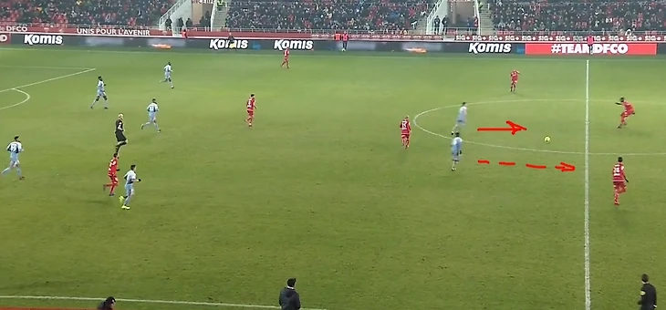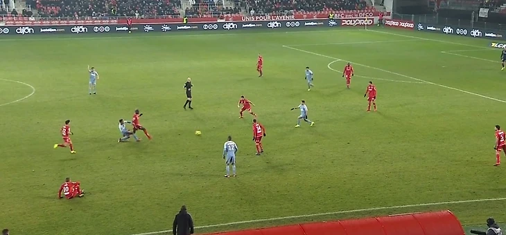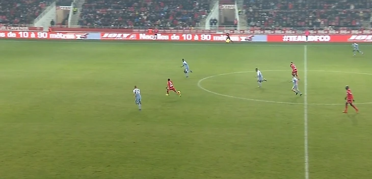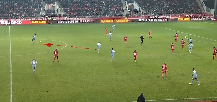 Фоде получает мяч, а полузащитник Дижона уже полностью готов встречать своего соперника. Кстати, защитник Монако мог дать неплохую передачу на ход Балло, Квон не успевал ее накрыть, не смотря на свою хорошую скорость. А после этой передачи можно было отлично продвинуть мяч по бровке, и свободная зона это позволяла.