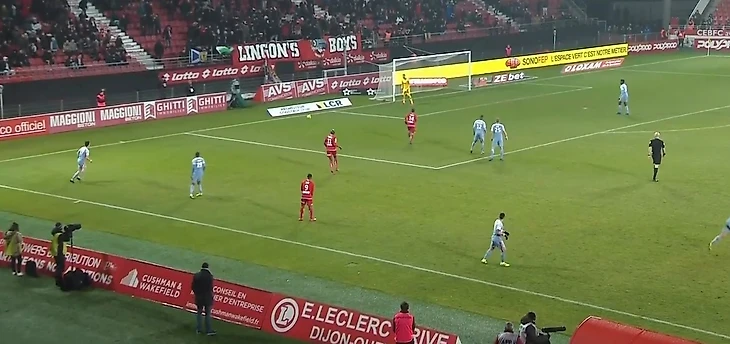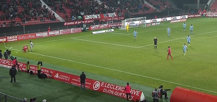 Спустя полминуты Головин зарабатывает штрафной и игрок «Дижона» получает желтую карточку.