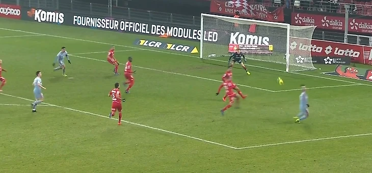 Но зачем обострять? Лучше откатить центральному защитнику, который все-таки переведет на заждавшегося уже Балло. А тем временем, Квон читает уже эту передачу и стягивает на край.