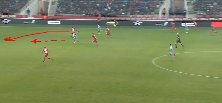 У Балло было достаточно много решений для того, чтобы не позволить игроку отобрать у себя мяч. Самое простое — выбить мяч в опасной ситуации подальше или, на крайний случай, увести мяч к бровке и уже выбить.