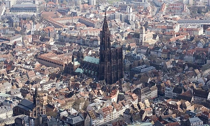 Здание в самом центре эмблемы – знаменитый Страсбургский собор, считающийся шедевром готического искусства (на фото ниже). Его уникальность в том, что собой он олицетворяет соединение французских и немецких архитектурных веяний. Окончательно отстроенный в XV веке, на протяжении следующих двух столетий он считался самым высоким зданием в мире. Одной из главных особенностей сооружения являются астрономические часы, расположенные на главной башне собора и показывающие положение на орбите всех известных на 1832 год планет Солнечной Системы (от Меркурия до Сатурна).