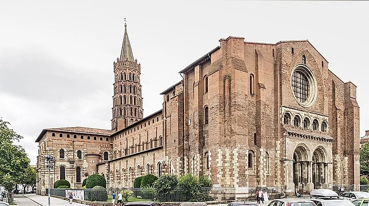 Здания по обе стороны композиции – наиболее культовые сооружения местности. Справа изображена базилика святого Сернина, строительство которой началось ещё в конце IV века (на фото). Сернин – изменённое на местный манер имя римского бога Сатурна, а аббатство Сен-Сернин является одним из древнейших во Франции. Нарисованная слева крепость подразумевает под собой замок в местечке Нарбонн недалеко от Тулузы.