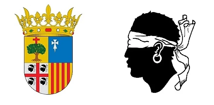 Справа вверху изображён человек, взятый с флага Корсики. Это – главный символ острова в виде «головы мавра». Он присутствует также на эмблемах почти всех клубов с родственной Сардинии и служит центральным элементом еще одного корсиканского клуба "Аяччо". История его происхождения доподлинно неизвестна, поэтому существует несколько версий: 1) флаг имеет арагонское происхождение, так как на гербе Арагонского королевства (на фото) также изображён этот символ. Раньше на нём голова мавра представлялась отрубленной, а на глаза была надета та самая повязка, что в современном виде у него на лбу; 2) вторая версия связана с легендой, согласно которой в XIII веке один мавританский дворянин похитил молодую корсиканку. Когда его поймали, ему отрубили голову и насадили на пику (средневековая классика), что и получило отображение на флаге; 3) так изображён египетский святой Маврикий, который в христианской иконографии часто рисуется с тёмным цветом кожи. Он особенно почитался в Савойе и долине Роны, а географическая близость Корсики даёт предположить, что на острове также имелся его культ.