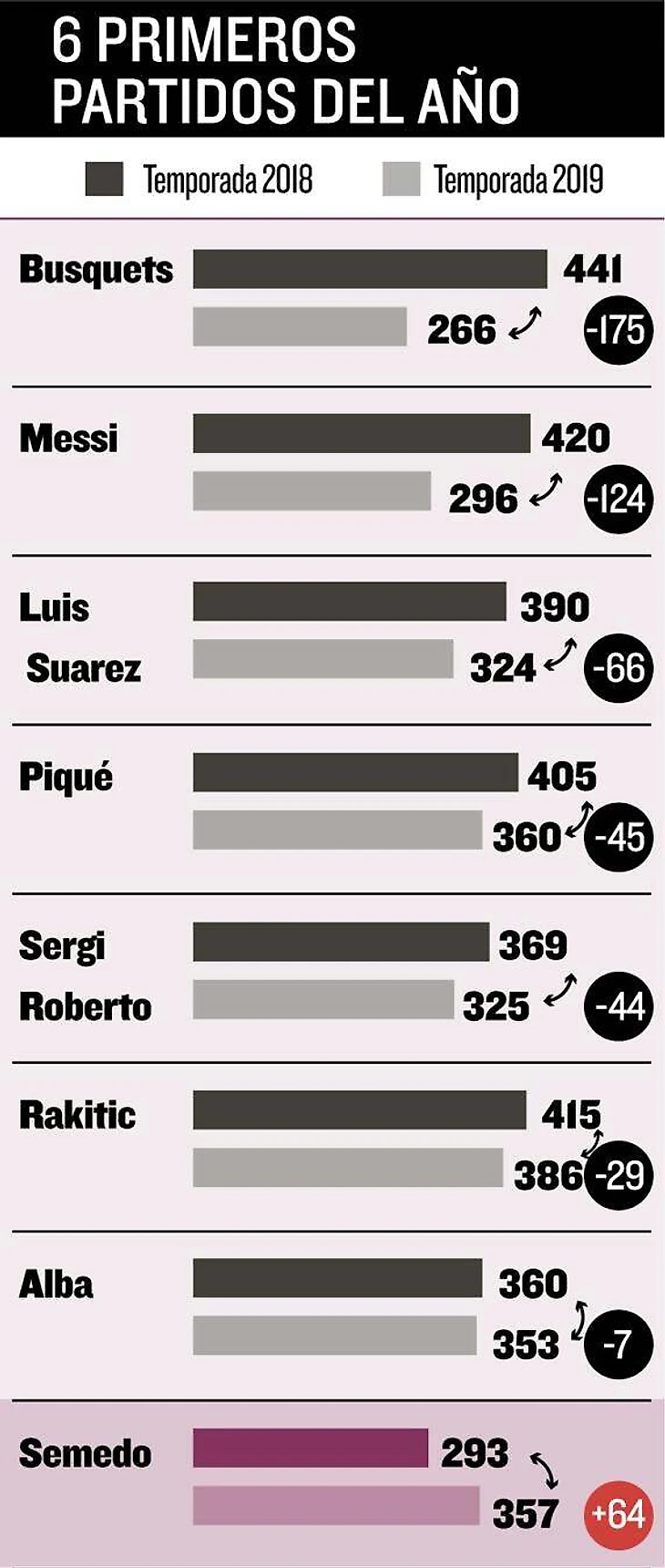 Как видно Вальверде дает отдохнуть основным лидерам команды по сравнению с прошлым годом, наибольшая разница у Бускетса (-175 минут). В то же время Альба почти всегда в старте, по скольку не имеет сменщика на своей позиции. Прибавил Семеду на тайм с небольшим.