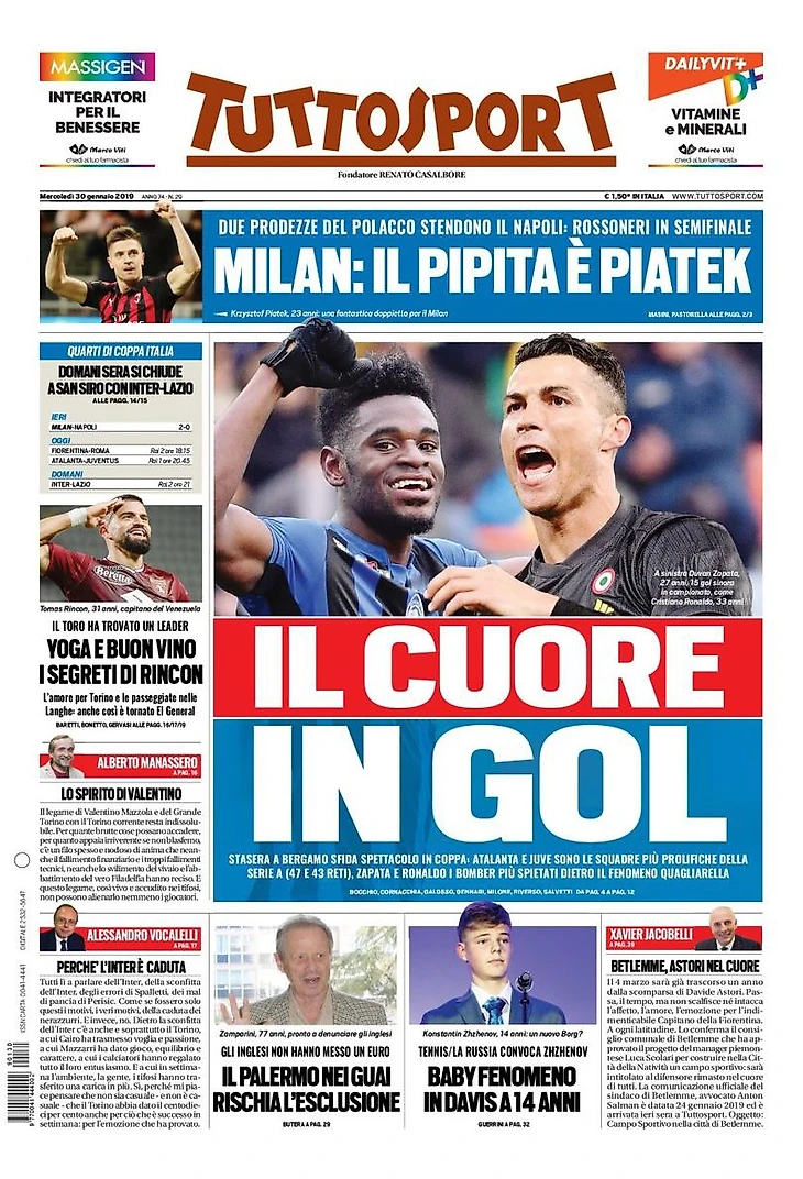Этим вечером в Бергамо драматичная схватка в Кубке: «Аталанта» и «Юве» – наиболее плодовитые команды в Серии А ( 47 и 43 гола), Сапата и Роналду – наиболее беспощадные бомбардиры позади феномена Куальяреллы.