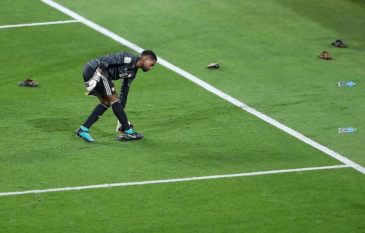 Вратарь ОАЭ Халид Эйса сразу же начал собирать брошенную обувь, чтобы очистить футбольное поле.