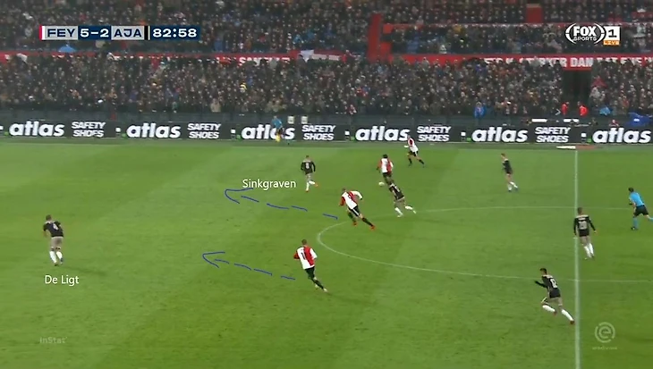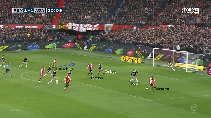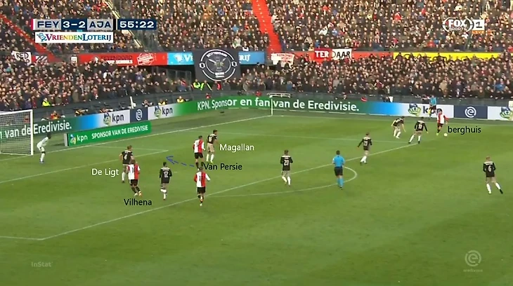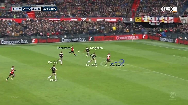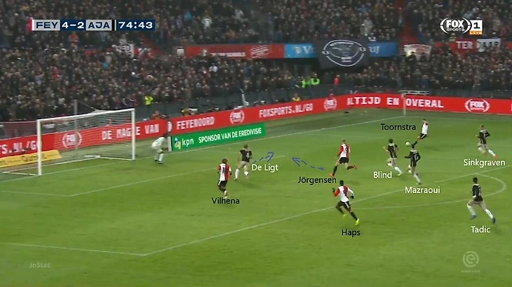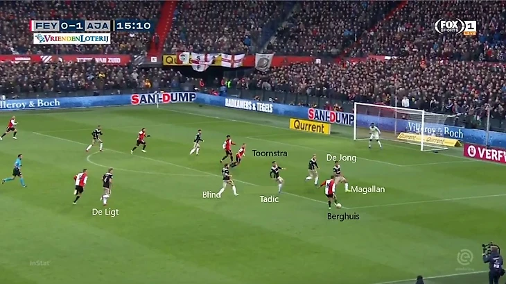 Дейли Блинд, Френки де Йонг, Лисандро Магальян и Душан Тадич пытаются помешать одному (!) футболисту «Фейеноорда», Стивену Берхюйсу, сделать навес. В результате двое игроков (!) роттердамцев, Джерри Сен-Жюст (правый защитник) и Йенс Торнстра (центральный полузащитник), остаются без присмотра в центре (!) штрафной «Аякса». По сути это стало результатом несогласованности Блинда и де Лихгта при попытке оказать давление на Берхюйса и ван Перси, что в итоге раскололо всю оборону.