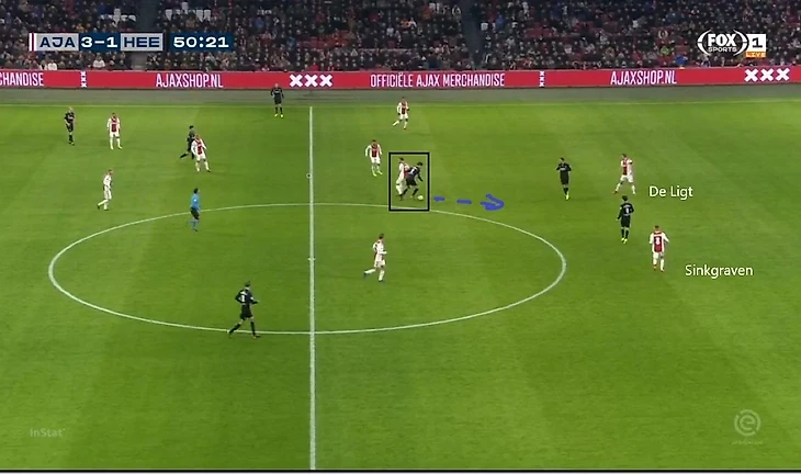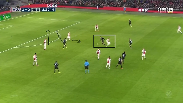 Игровая ситуация: «Аякс» вяло пытается прессинговать в начальной фазе атаки «Херенвена». В результате защитник гостей Кик Пири легко находит мячом Сэма Ламмерса в центре поля.