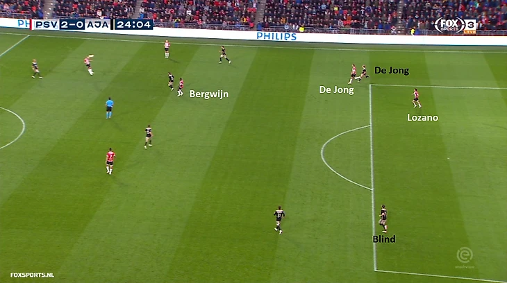Вспоминанием второй гол ПСВ. Хирвинг Лозано оказывает давление на Андре Онана и вынуждает камерунца выбивать мяч вперед. Люк де Йонг получает дивиденды от скидки партнера и ошибки де Йонга. Блинд и Тальяфико остаются в роли статистов.